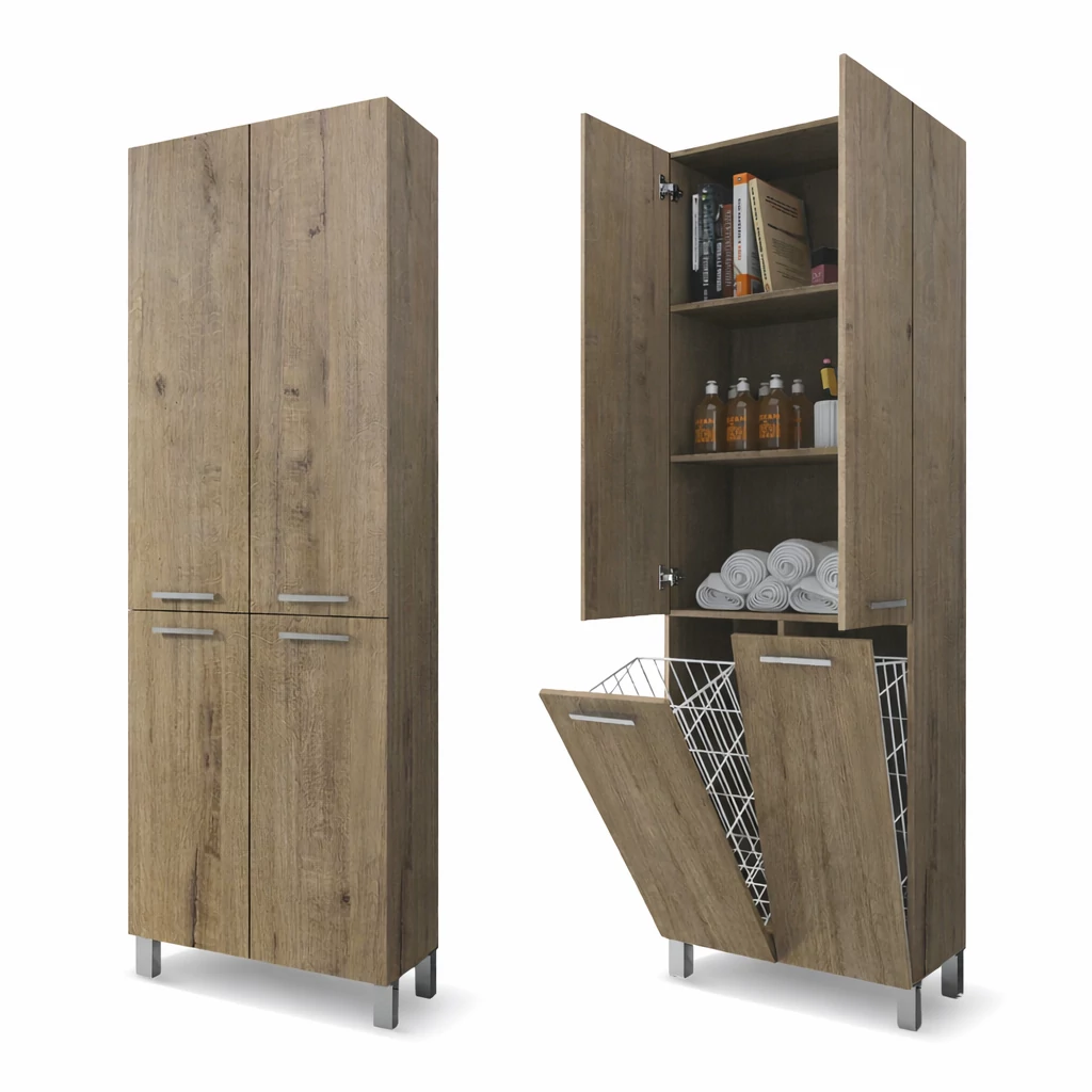 Elegancka i oszczędzająca miejsce szafka łazienkowa NORMANDIA 60 z wbudowanym koszem na pranie, schowkiem i półkami.