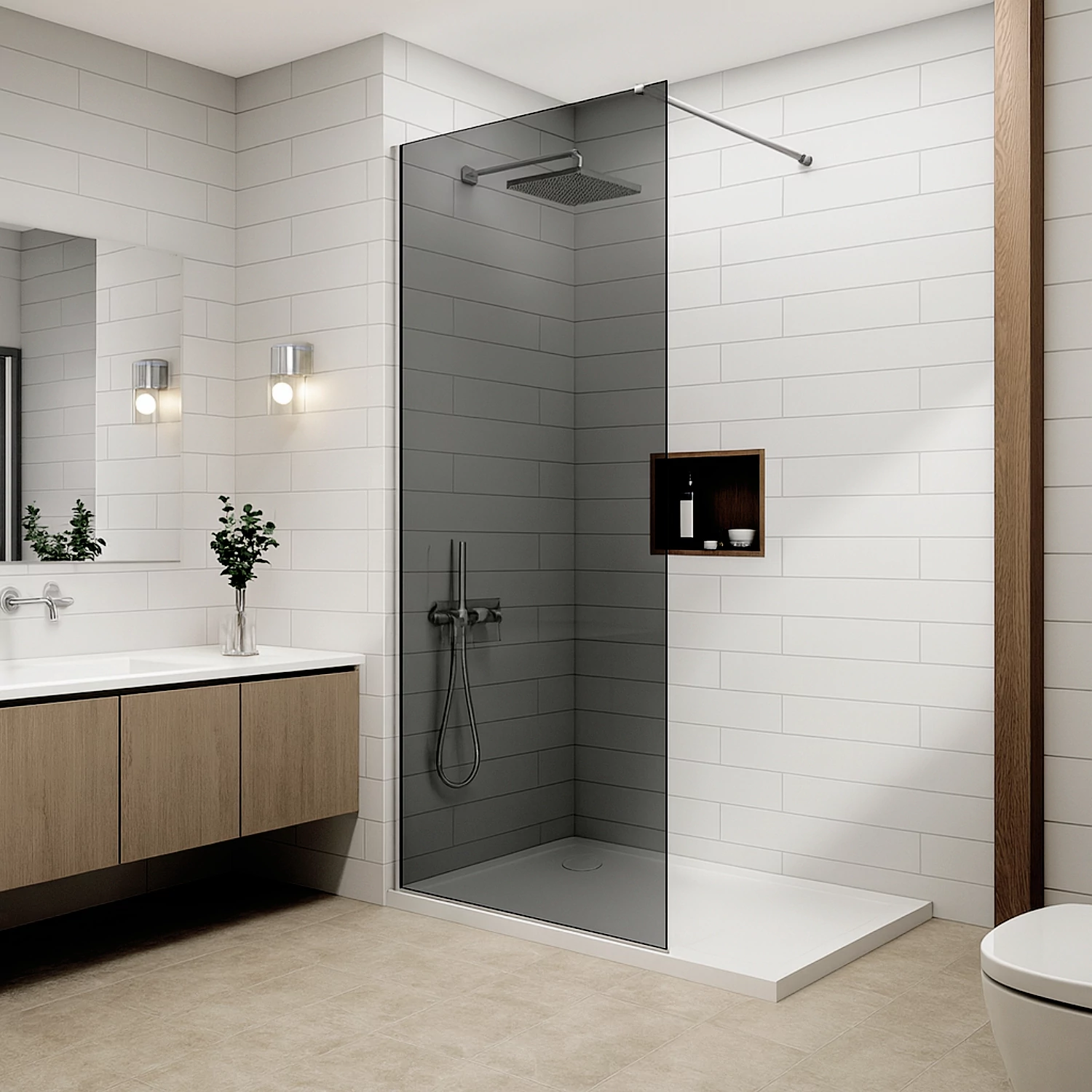 Nasze ścianki prysznicowe zapewniają klarowny i elegancki wygląd również w Twojej łazience. Poza tym, nasze produkty są dostępne w szerokiej gamie barw i rozmiarów, są również niezwykłe łatwe w instalacji. Szyby bezpieczne o grubości 8 mm oraz stal nierdzewna przekładki zapewniają długą żywotność ściany prysznica oraz wygodne i bezpieczne użytkowanie. Powierzchnia szklanej płyty również została poddana NANO powłoce, podczas której stała się bardziej odporna na kamień, mydło i inne osady, dzięki czemu niezwykle łatwo utrzymać ją w czystości. Pręt dystansowy ze stali nierdzewnej można przyciąć na dowolny wymiar, dzięki czemu głębokość montażu nie jest ograniczona. Pręt dystansowy można ustawić w zakresie 68-120 cm. Dzięki zastosowanym komponentom, kierunek montażu jest uniwersalny, dlatego można je montować zarówno w kierunku prawym, jak i lewym. Możliwe nierówności ściany można doskonale wyeliminować, ponieważ profil ściany można regulować o 1,5 cm. Nasze ścianki prysznicowe można montować zarówno na podłodze wyłożonej kafelkami, jak i na brodziku prysznicowym.